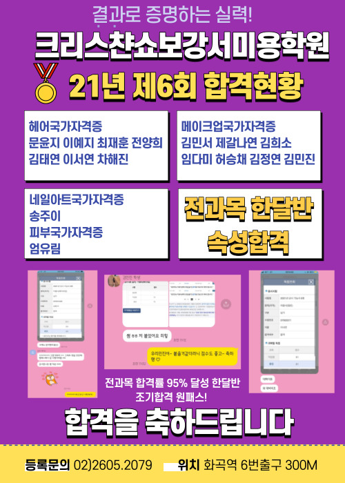오늘 발표된 전과목 국가자격증 6회 합격자명단! 페이지 정보 작성자 크리스챤쇼보 강서캠퍼스 조회 368회 작성일 2021-04-15 17:09 본문 최고의합격률!!!강서미용학원의 국가자격증 합격자명단! SNS공유 목록 5회 6회 헤어국가자격증 합격자명단입니다^^ 21.04.15 네일아트 국가자격증 / 네일실무과정 한번에 끝내기! 네일취업 / 창업전문학원 강서크리스챤쇼보 21.04.14